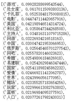 keywords = jieba.analyse.extract_tags(str, topK=20, withWeight=True, allowPOS=('n','nr','ns'))