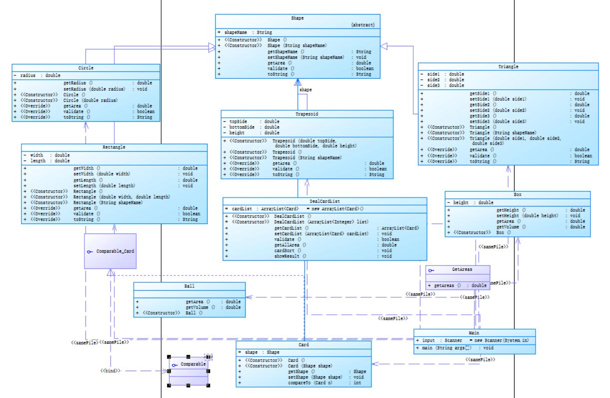 就7-1而言,本次为图形卡片排序游戏,通过设计出一个抽象Shape类,进而对Shape进行拓展出三角形,圆形,矩形,梯形类,其中在主类进行对象合法性的检验以及对应图形数量的添加。在不同的主体类中有着大致相同的方法:求面积,合法性校验,Set,Get方法,在DealCardList业务类中进行对对应具体图形类属性的添加,进而将实体类与业务类联系起来。实体类都继承于Shape类中。而在代码中设计了求面积的接口类,实现了求面积的多态。功能体现在对输入的图形进行求面积处理,其次进行了排序,最后求出面积总和。对于多对象情况,采用存在ArrayList中进行流水线式的处理,使代码更为简洁,不需要一个个判断后再进行添加。设计遵守了单一职责原则以及“开-闭”原则,便于7-2题目的拓展功能添加。