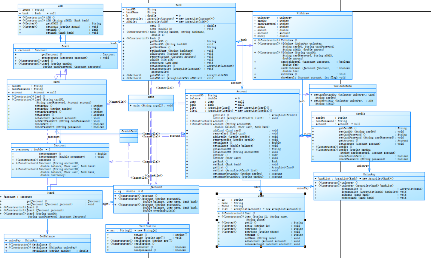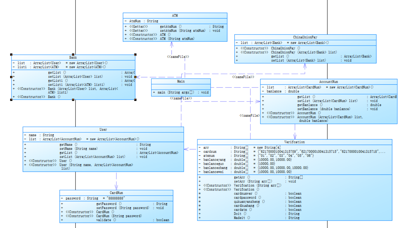 3.在账户之间设定可联系的类,可为后续设计转款功能作为基础,或是在数据处理类中添加方法去完成转款功能。