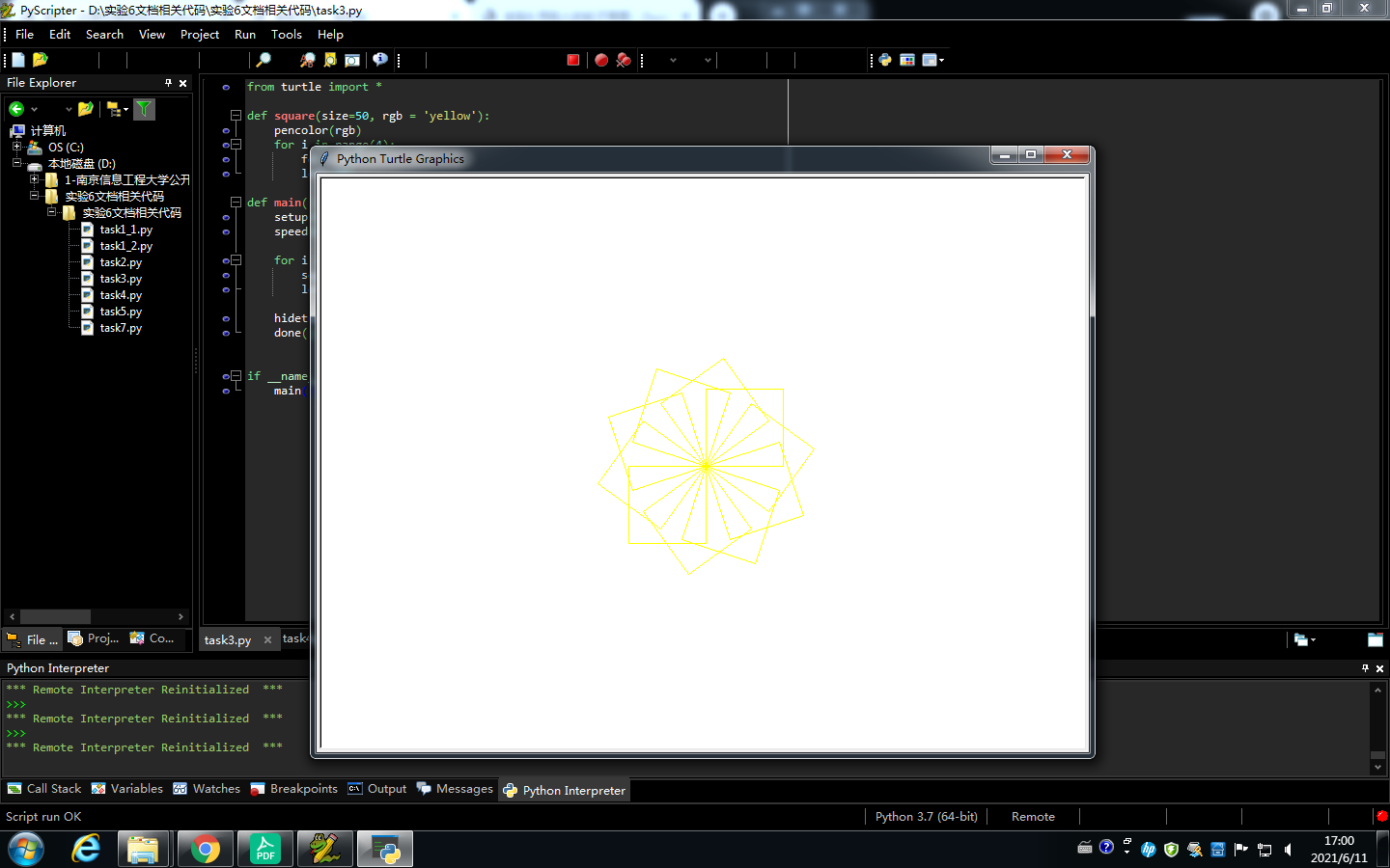 from turtle import * def square(size=50, rgb = 'yellow'): pencolor(rgb) for i in range(4): fd(size) left(90) def main(): setup(800, 600) speed(0) for i in range(10): square(80) left(36) hideturtle() done() if __name__ == '__main__': main()