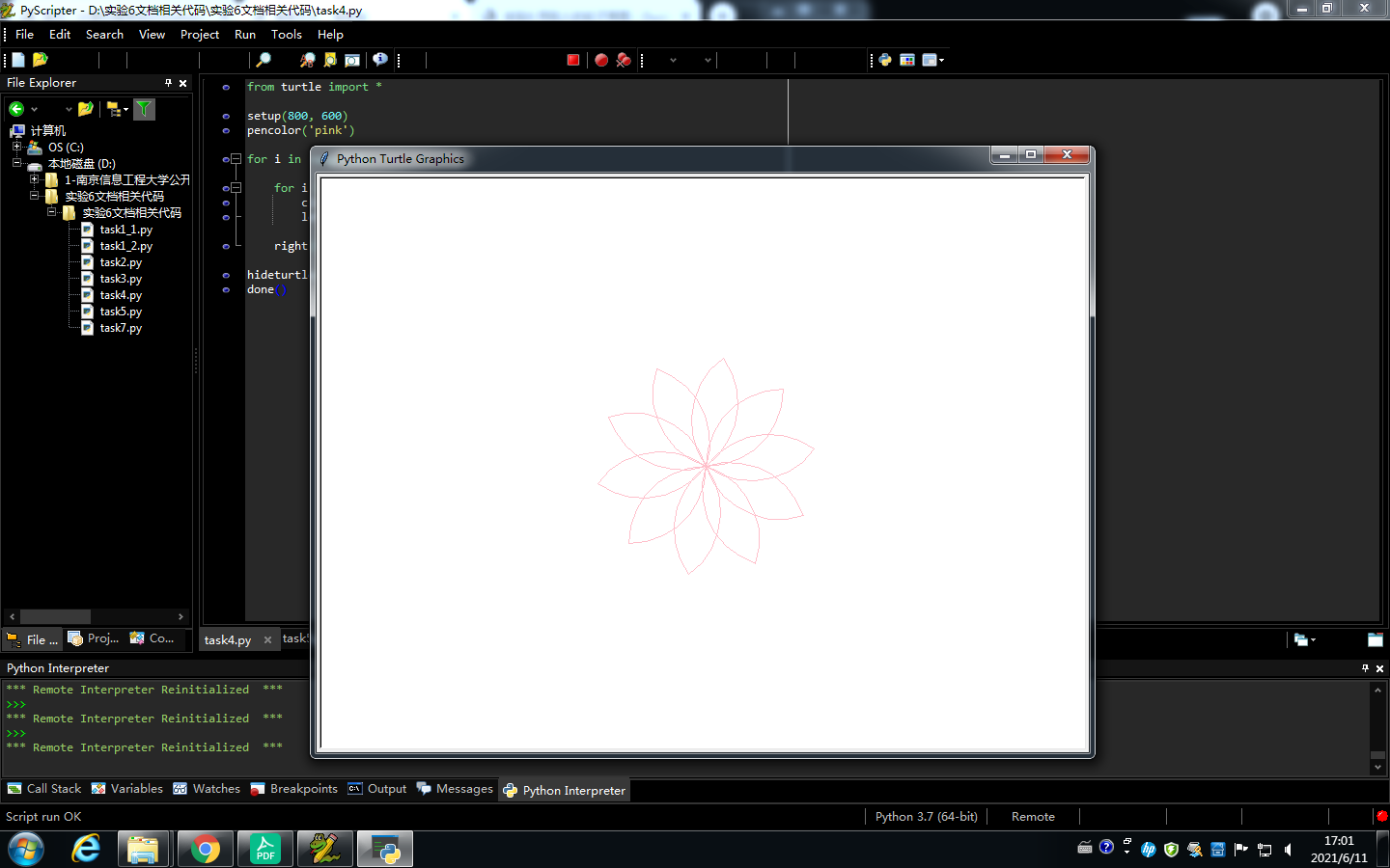 from turtle import * setup(800, 600) pencolor('pink') for i in range(10): for i in range(2): circle(80, 90) left(90) right(36) hideturtle() done()