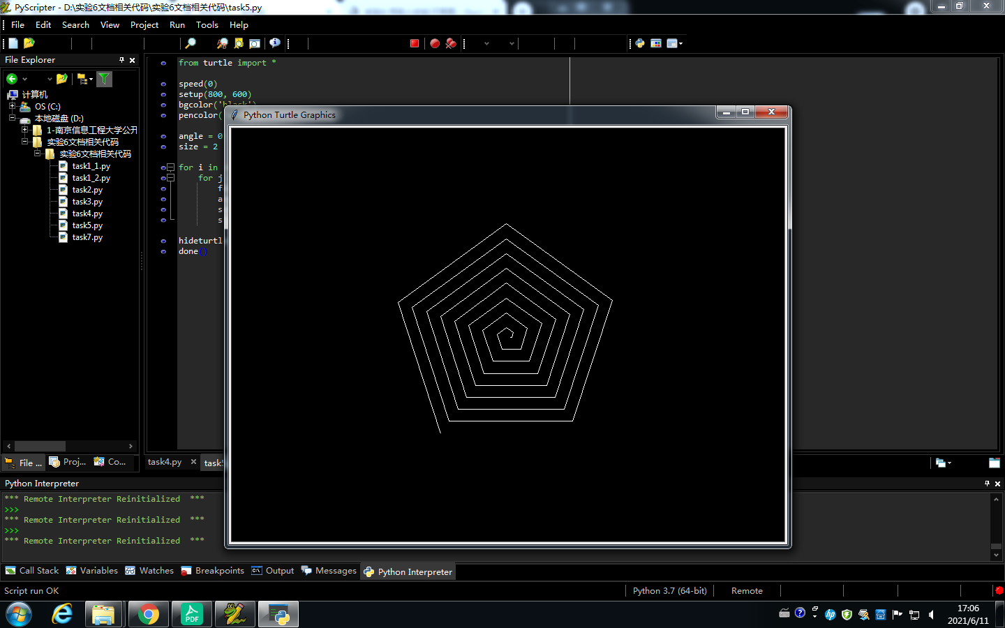from turtle import * speed(0) setup(800, 600) bgcolor('black') pencolor('white') angle = 0 size = 2 for i in range(10): for j in range(4): fd(size) angle += 72 seth(angle) size += 5 hideturtle() done()