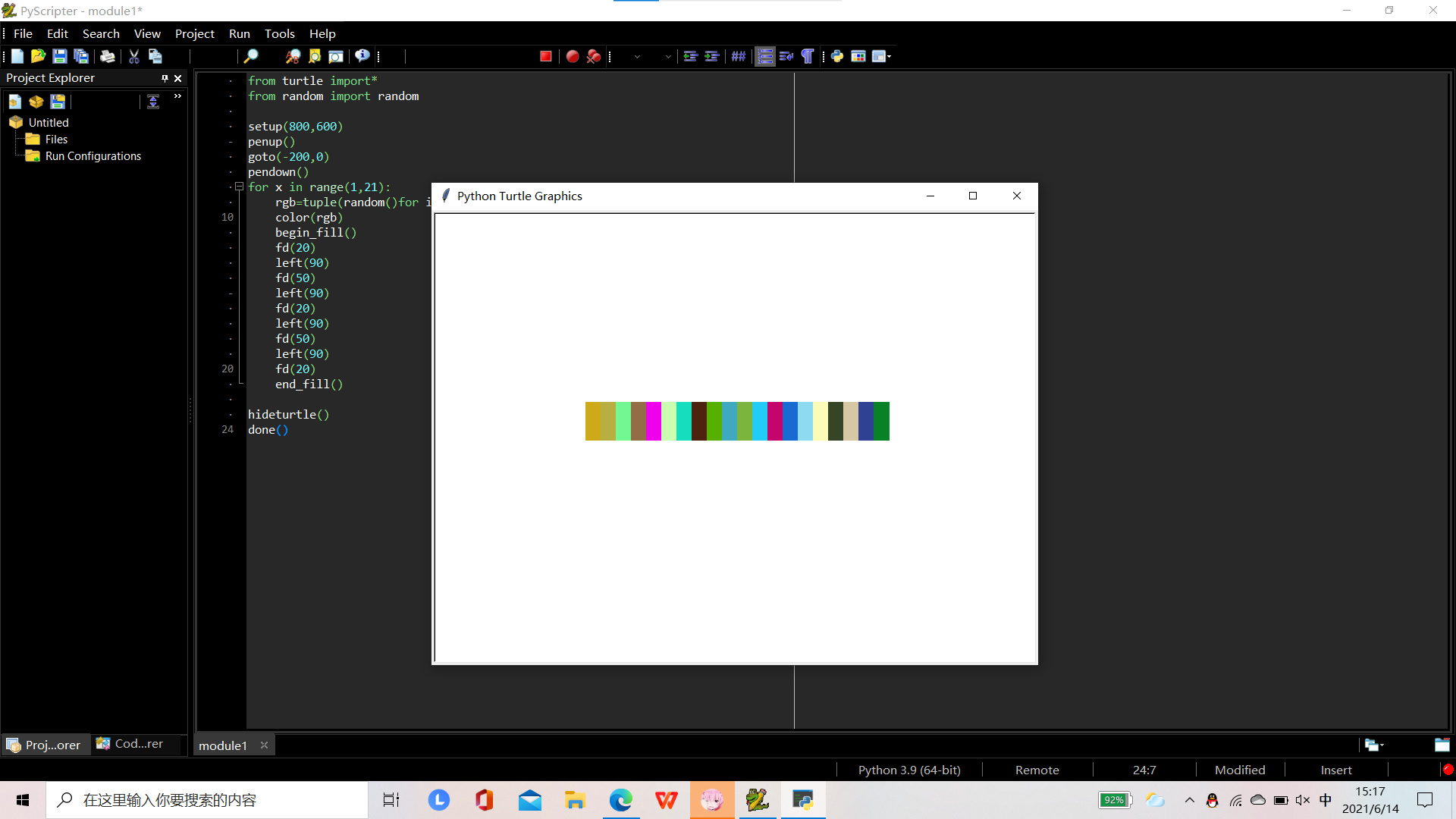 from turtle import* from random import random setup(800,600) penup() goto(-200,0) pendown() for x in range(1,21): rgb=tuple(random()for i in range(3)) color(rgb) begin_fill() fd(20) left(90) fd(50) left(90) fd(20) left(90) fd(50) left(90) fd(20) end_fill() hideturtle() done()