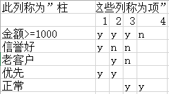 例如,从编号为1,2的列可以看出,顾客订单>=1000,信誉好,不管是新顾客还是老顾客,都设为优先,于是上面的表合并整理后,得到下表