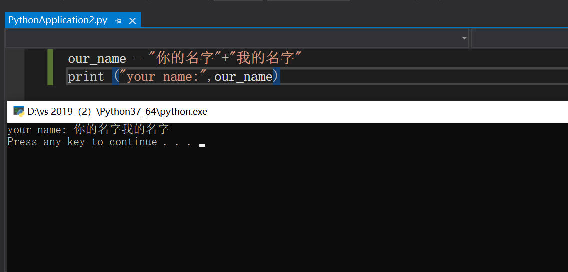 1 our_name = "你的名字"+"我的名字" 2 print ("your name:",our_name)