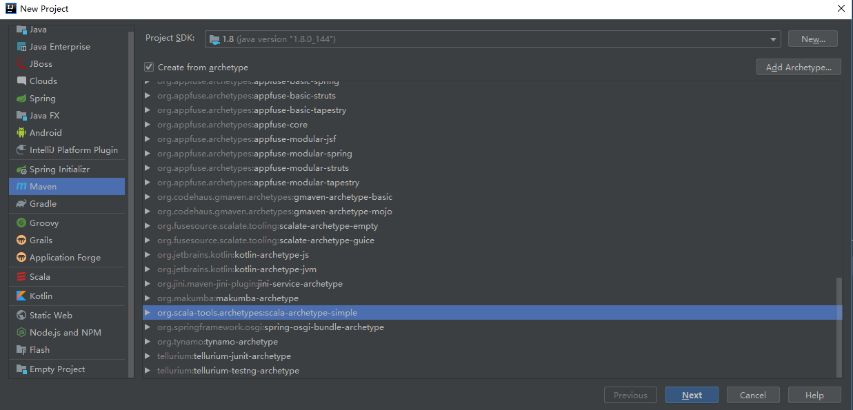 选择Maven,Project SDK选择JDK8,Create from archetype选择scala tools