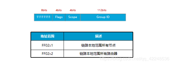 (3)前缀:IPv6组播地址的前缀是FF00::/8(1111 1111)。
