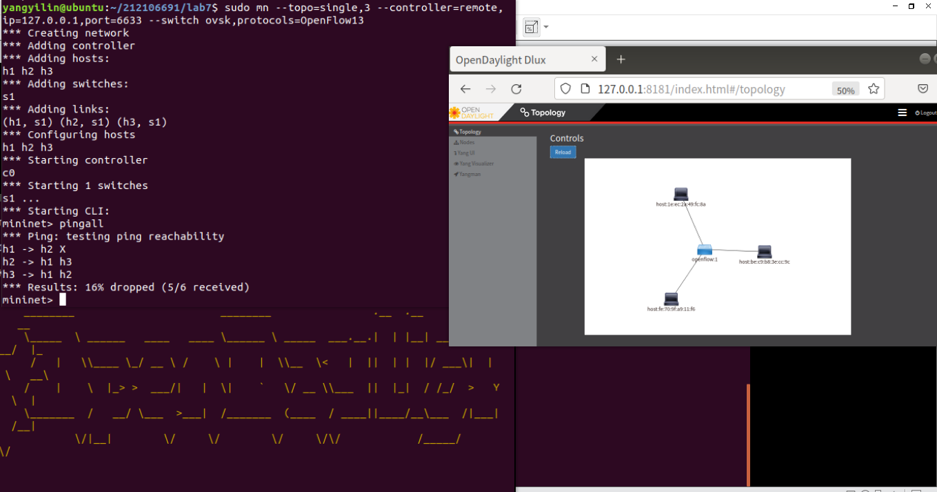 (1) 利用Mininet平台搭建下图所示网络拓扑,并连接OpenDaylight;![]()