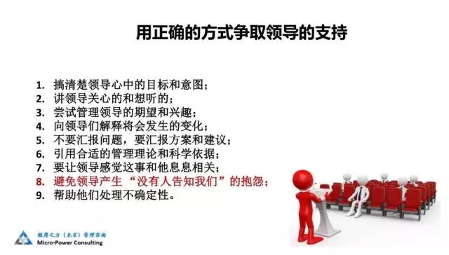08/再一个是跟领导要保持密切沟通,很多时候跟领导的信任关系,能够让领导放心,非常重要的一点是要随时保证密切的沟通,把所有重要的信息随时汇报给他,同时了解他的想法。大家知道,沟通、协同和信任其实就是通过不断的回补才能够形成,一定要避免领导认为这个人老不跟我汇报,有什么事都不告诉我,这将来你要想获得领导的支持就很困难。