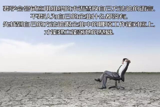 如果大家想把自己的项目管理落到企业里,首先不要认为自己的企业什么都没有,先找到自己的方法论跟企业中的哪项工作能对应上,这样的话我们才能建立能落地的基础。首先要学会尝试应用组织的术语替换自己方法论的语言,这也是我们推行一个项目方法做剪裁时非常关键的一点。