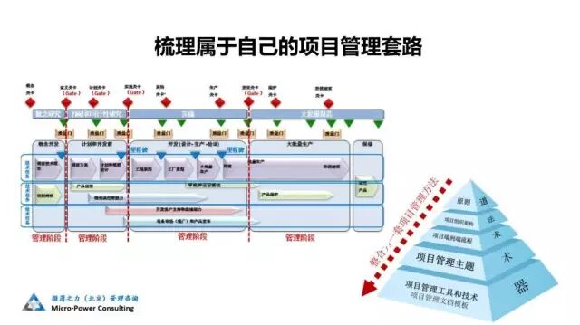 做项目,大家首先要尽量找到跟自己的项目比较相近的项目管理方法,然后再结合自己企业的文化特点,结合自己企业的项目特点、关键控制点和关键风险问题点,去梳理出一个属于自己的项目管理套路。核心还是要自己首先理顺做项目的套路是什么,自己的项目本身的逻辑是什么,里面的业务流程有哪些,有哪些关键的控制点、技术路线和关键的人,这些人的角色职责是什么,这些东西要靠自己从头到尾进行端到端的梳理,梳理出来之后才能形成自己的套路。