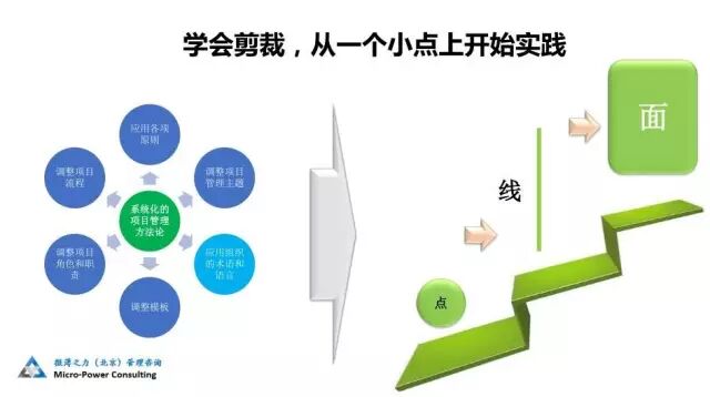 有一点一直以来我非常认同的,就是当我们尝试着把项目管理方法往自己的项目去讨论的时候,这时候叫剪裁,不是根植,有一些企业会干一些根植的事,就是整个企业照搬外面一套系统化的方法,那是企业行为、组织行为。现在要谈的是一个项目经理想尝试把自己认为好的一套方法带到项目中,让大家共同地去使用这套方法的时候,他所需要做的这件事叫剪裁。
