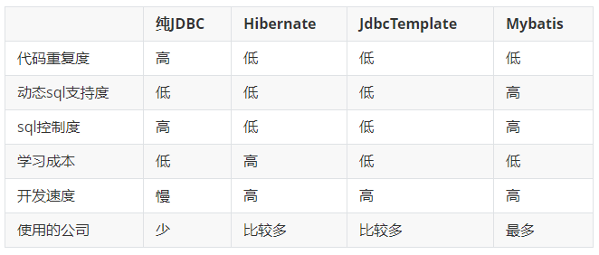 mybatis相对于纯jdbc来说,也隐藏了重复性的工作,mybatis是一个半自动化的orm框架,为什么说是半自动化的呢,因为他需要我们自己去写sql,而他做的更好的地方就是动态sql的支持上面,而上面说的各种技术,面对与动态sql只能自己写很多判断去组装sql,而这些判断和组装在mybatis中实现起来就非常简单了,完全由mybatis去帮我们实现了。mybatis将sql交由开发者去控制,所以在sql的优化方面,开发者可以随心所欲,也就是说mybatis将重复性的工作优化到了极致:操作db的过程、动态sql的拼装、结果和对象的映射,这些mybatis都帮我们实现的很好,而让我们将更多的经历花在sql的写法和优化上面,所以毫无疑问mybatis使用人数和公司也是最多的,大部分互联网公司基本上都会使用mybatis,其他2种可以不会,但是mybatis你必须要会。