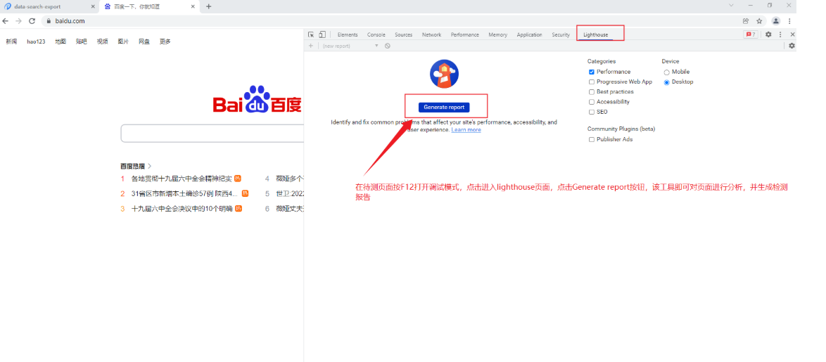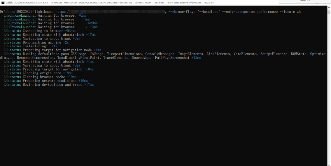 打开cmd,在其中输入如下命令并回车,lighthouse命令后面跟的是待压测的页面地址以及参数