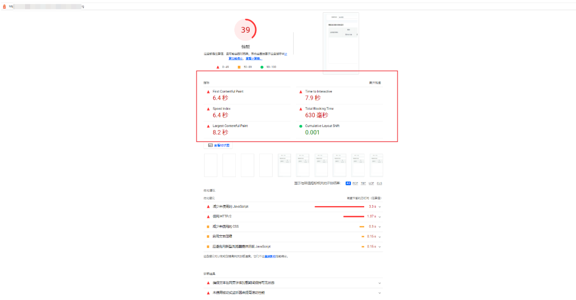 速度指标(Speed Index):衡量了首屏可见内容绘制在屏幕上的速度。在首次加载页面的过程中尽量展现更多的内容,往往能给用户带来更好的体验,所以速度指标的值约小越好。