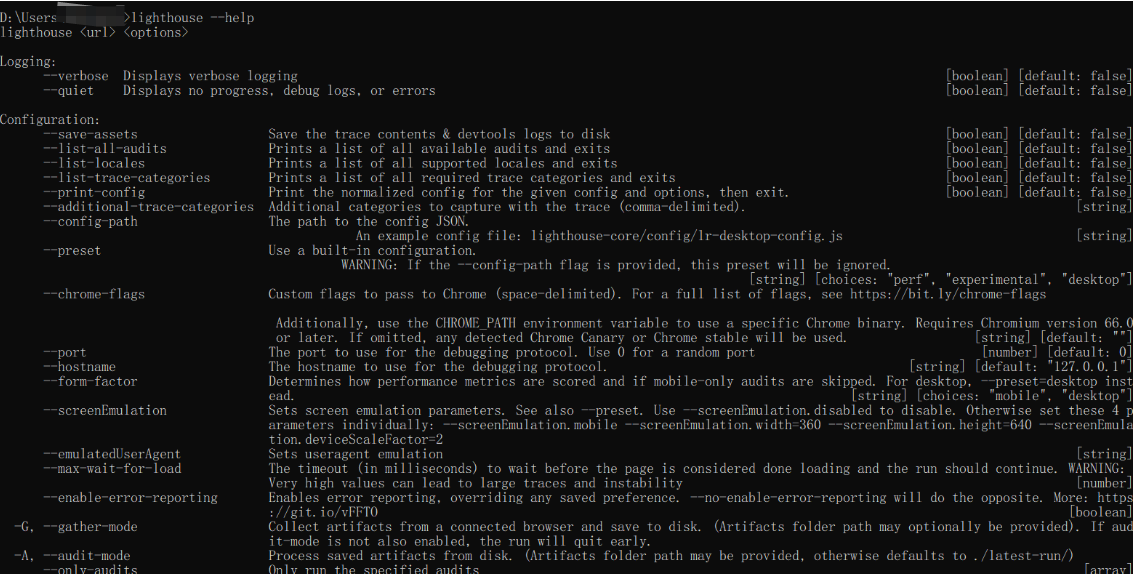 安装后,在cmd页面中输入lighthouse --help,如果出现此页面说明命令行模式的lighthouse安装成功
