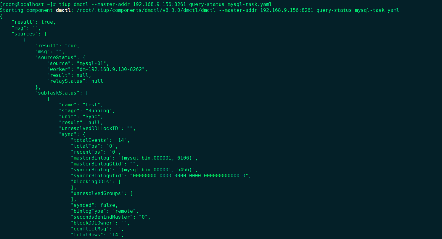 tiup dmctl --master-addr 192.168.9.156:8261 query-status mysql-task.yaml