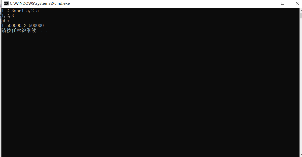 #include <stdio.h> int main() { double x,y; char c1,c2,c3; int a1,a2,a3; scanf("%d%d%d",&a1,&a2,&a3); printf("%d,%d,%d\n",a1,a2,a3); scanf("%c%c%c",&c1,&c2,&c3); printf("%c%c%c\n",c1,c2,c3); scanf("%lf,%lf",&x,&y); printf("%lf,%lf\n",x,y); return 0; }