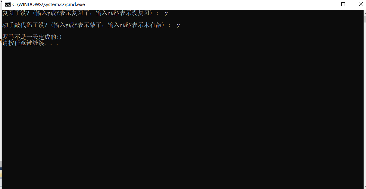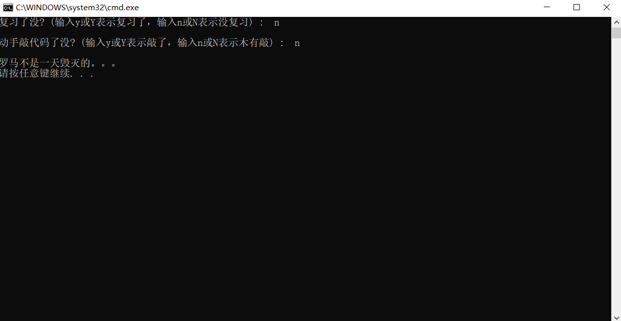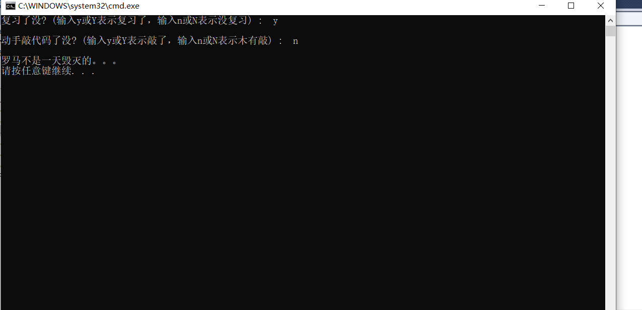 #include <stdio.h> int main() { char ans1, ans2; printf("复习了没? (输入y或Y表示复习了,输入n或N表示没复习) : "); ans1 = getchar(); getchar(); printf("\n动手敲代码了没? (输入y或Y表示敲了,输入n或N表示木有敲) : "); ans2 = getchar(); if((ans1=='y'||ans1=='Y') && (ans2=='y'||ans2=='Y')) printf("\n罗马不是一天建成的:)\n"); else printf("\n罗马不是一天毁灭的。。。\n"); return 0; }