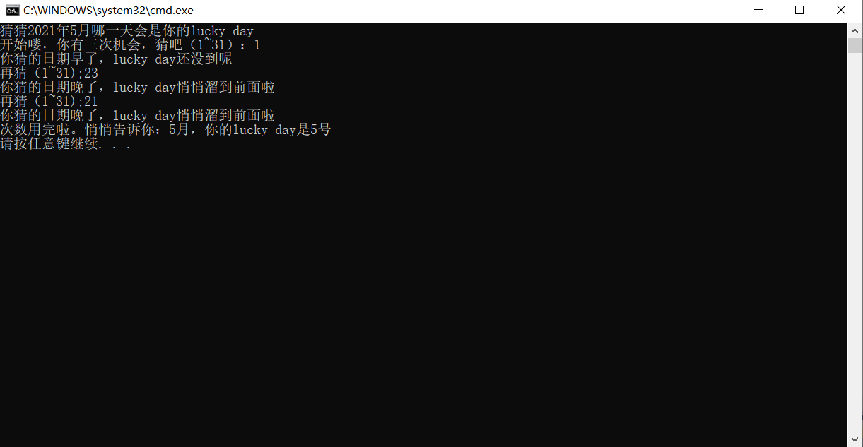 #define _CRT_SECURE_NO_WARNINGS 1 #include<stdio.h> #include<stdlib.h> #include<time.h> int main() { int x, i, date; srand(time(0)); x = rand() % 32; printf("猜猜2021年5月哪一天会是你的lucky day\n"); printf("开始喽,你有三次机会,猜吧(1~31):"); for(i = 1; i <= 3; i++) { scanf("%d", &date); if(date == x) break; else if(date > x) printf("你猜的日期晚了,lucky day悄悄溜到前面啦\n"); else printf("你猜的日期早了,lucky day还没到呢\n"); if(i < 3) printf("再猜(1~31);"); else printf("次数用完啦。悄悄告诉你:5月,你的lucky day是%d号\n",x); } return 0; }