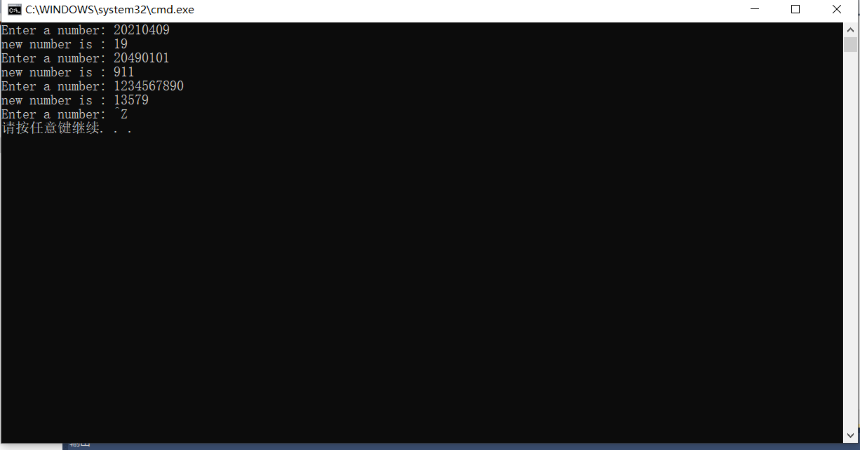 #define _CRT_SECURE_NO_WARNINGS 1 #include<stdio.h> #include<math.h> void getodd(long x); int main() { long num; printf("Enter a number: "); while(scanf("%ld",&num) != EOF) { getodd(num); printf("Enter a number: "); } return 0; } void getodd(long x) { long odd; int place, i; double system = 10; i = 0; odd = 0; while(x > 0) { place = x % 10; x = x / 10; if(place % 2 == 1) { odd = odd + place * pow(system,i); i++; } } printf("new number is : %ld\n", odd); }