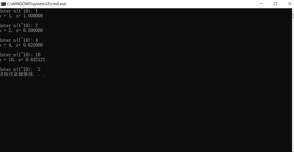 #include <stdio.h> double fun(int n); // 函数声明 int main() { int n; double s; printf("Enter n(1~10): "); while(scanf("%d", &n) != EOF) { s = fun(n); // 函数调用 printf("n = %d, s= %f\n\n", n, s); printf("Enter n(1~10): "); } return 0; } // 函数定义 double fun(int n) { int i; double num, den,s; num = 1; den = -1; s = 0; for(i = 1; i <= n; i++) { den = 0 - den * i; s = s + num/den; } return s; }