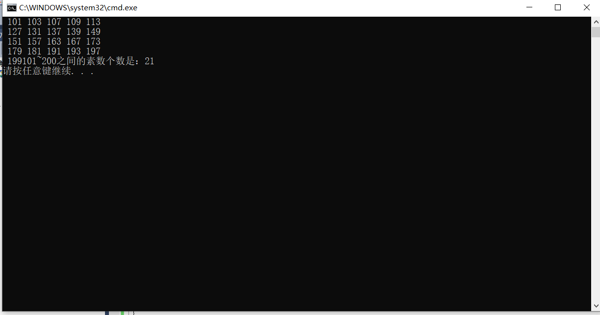 #include<stdio.h> #include<math.h> int isPrime(double x); int main() { int row, prime; double num; row = 0; prime = 0; for(num = 100; num <201; num++) { if(isPrime(num)) { row++; printf("%4.0lf", num); prime++; if(row % 5 == 0) printf("\n"); } } printf("101~200之间的素数个数是:%d\n", prime); return 0; } int isPrime(double x) { int i, num; num = x; for(i = 2; i <= sqrt(x); i++) { if(num % i == 0) return 0; } return 1; }
