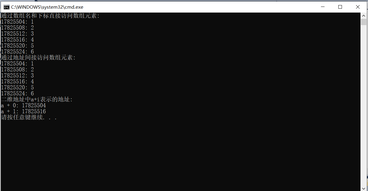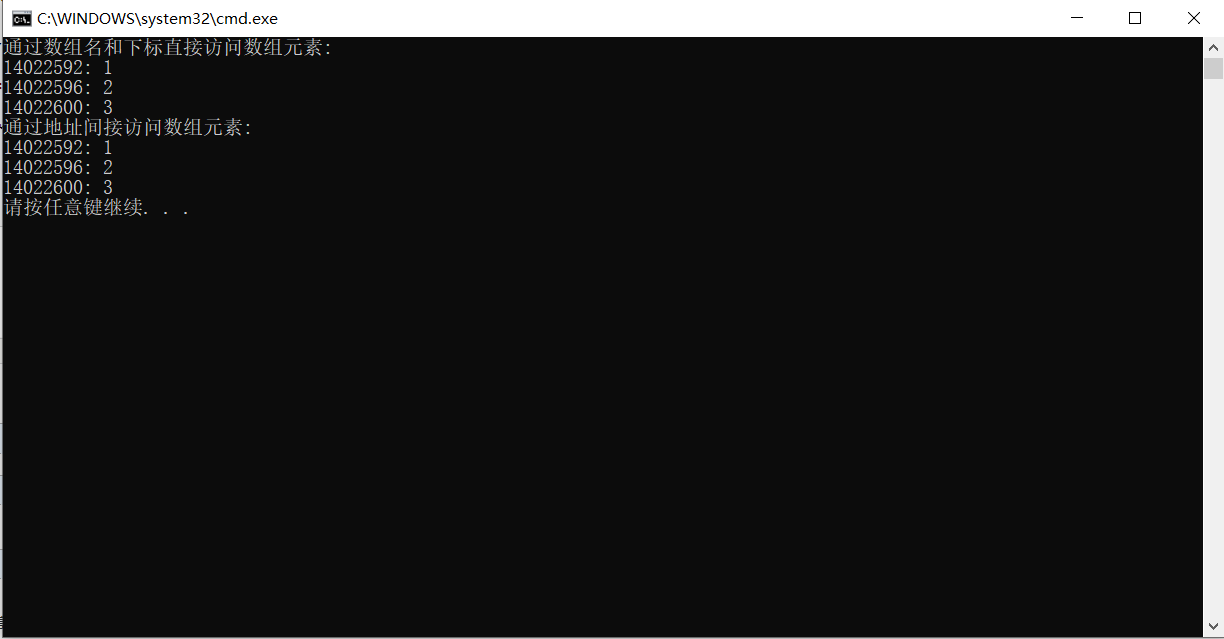 #include <stdio.h> const int N=3; int main() { int a[N] = {1, 2, 3}; int i; printf("通过数组名和下标直接访问数组元素:\n"); for(i=0; i<N; i++) printf("%d: %d\n", &a[i], a[i]); printf("通过地址间接访问数组元素:\n"); for(i=0; i<N; i++) printf("%d: %d\n", a+i, *(a+i)); return 0; }