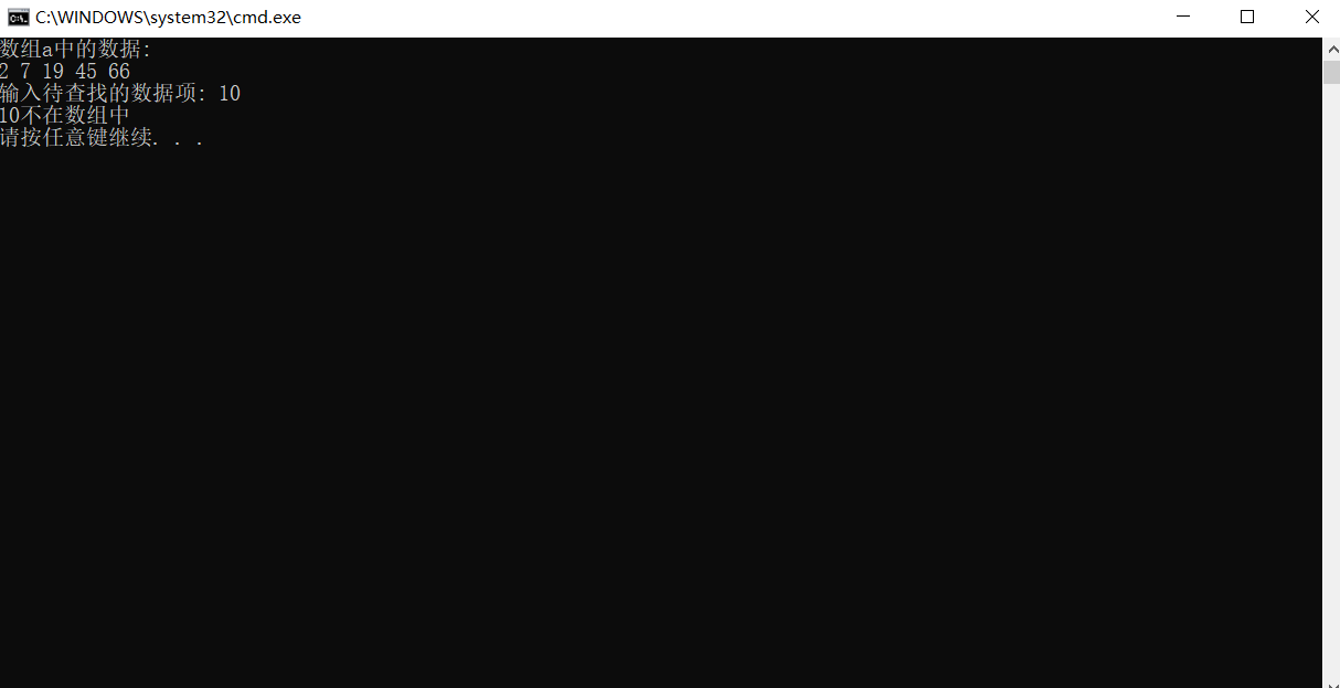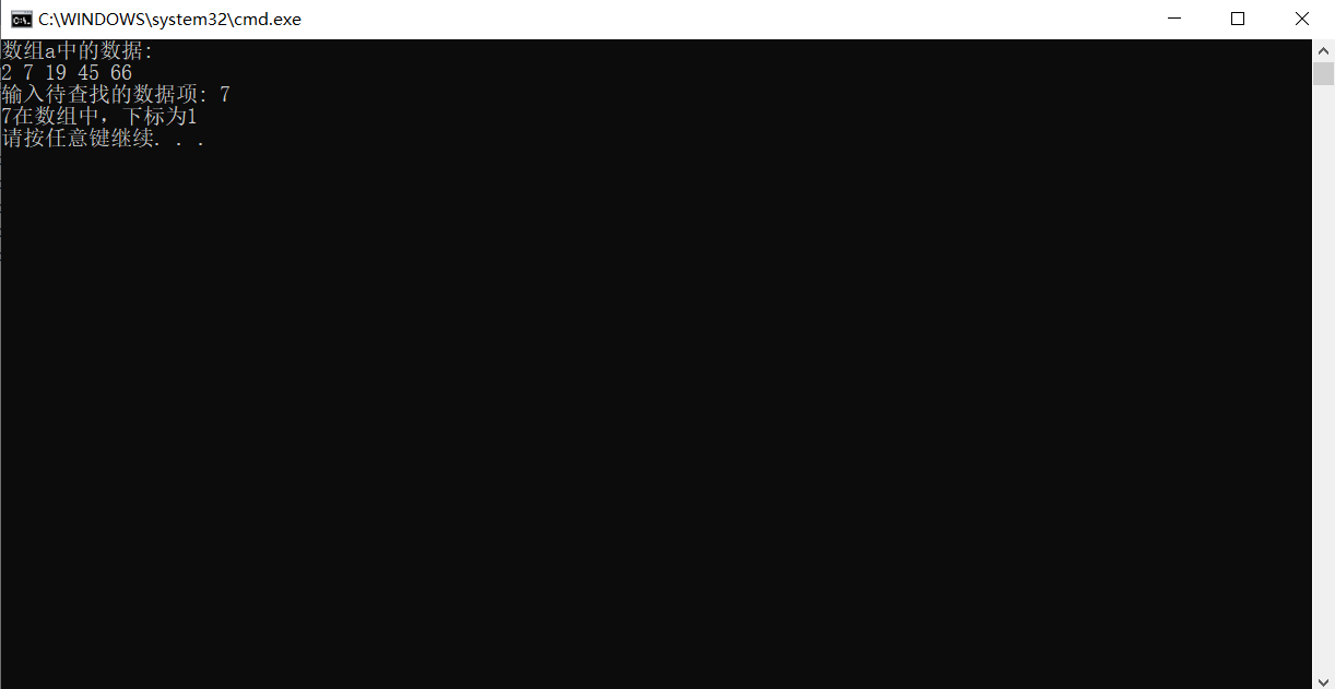 // 练习:使用二分查找,在一组有序元素中查找数据项 // 形参是指针变量,实参是数组名 #include <stdio.h> const int N=5; int binarySearch(int *x, int n, int item); // 函数声明 int main() { int a[N]={2,7,19,45,66}; int i,index, key; printf("数组a中的数据:\n"); for(i=0;i<N;i++) printf("%d ",a[i]); printf("\n"); printf("输入待查找的数据项: "); scanf("%d", &key); // 调用函数binarySearch()在数组a中查找指定数据项key,并返回查找结果给index // 补足代码① index=binarySearch(a,N,key);// ××× if(index>=0) printf("%d在数组中,下标为%d\n", key, index); else printf("%d不在数组中\n", key); return 0; } //函数功能描述: //使用二分查找算法在从x中查找特定值item,数组x大小为n // 如果找到,返回其下标 // 如果没找到,返回-1 int binarySearch(int *x, int n, int item) { int low, high, mid; low = 0; high = n-1; while(low <= high) { mid = (low+high)/2; if ( item == *(x+mid) ) return mid; else if(item < *(x+mid)) high=mid-1; else low=mid+1; } return -1; }