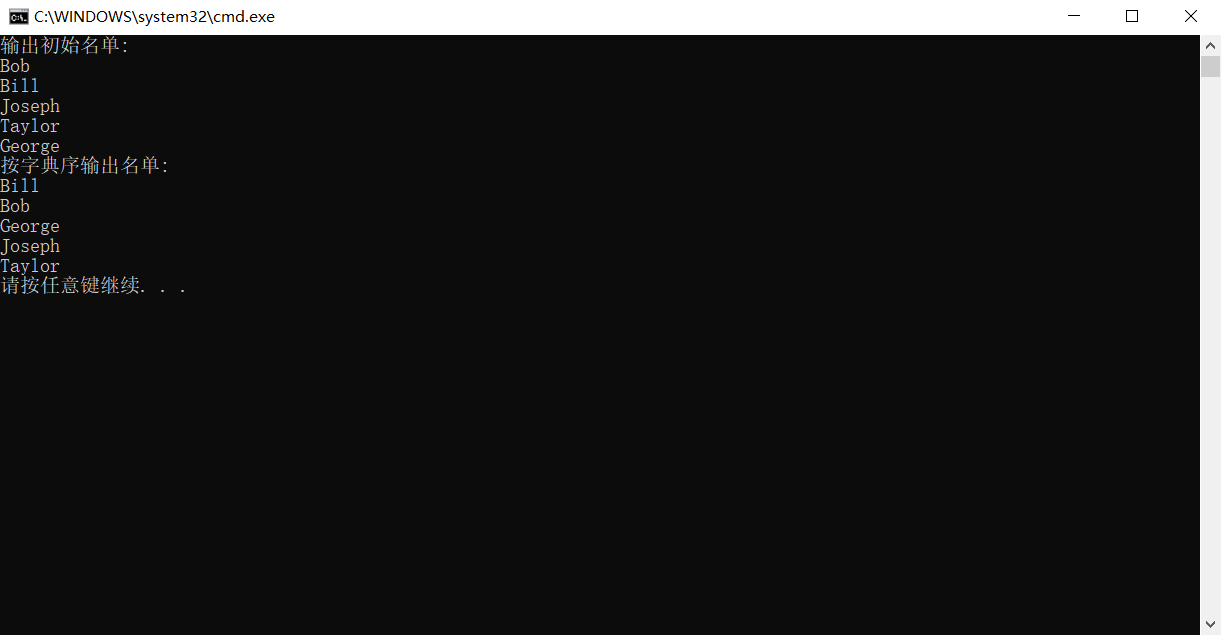 // 练习:使用选择法对字符串按字典序排序 #include <stdio.h> #include<string.h> const int N = 5; void selectSort(char str[][20], int n ); // 函数声明,形参str是二维数组名 int main() { char name[][20] = {"Bob", "Bill", "Joseph", "Taylor", "George"}; int i; printf("输出初始名单:\n"); for(i=0; i<N; i++) printf("%s\n", name[i]); selectSort(name, N); // 调用选择法对name数组中的字符串排序 printf("按字典序输出名单:\n"); for(i=0; i<N; i++) printf("%s\n", name[i]); return 0; } // 函数定义 // 函数功能描述:使用选择法对二维数组str中的n个字符串按字典序排序 void selectSort(char str[][20], int n) { // 补足代码 // ××× int i, j, k; char temp[20]; for(i=0; i<n-1; i++) { k = i; // k用于记录当前最小元素的下标 for(j=i+1; j<n; j++) if (strcmp(str[j] , str[k])<0) k = j; // 如果a[j]比当前最小元素还要小,就更新k,确保它总是存放最小元素的下标 if(k != i) { // 找到最小元素后,交换a[i]和a[k] strcpy(temp , str[i]); strcpy(str[i] ,str[k]); strcpy(str[k] , temp); } } }