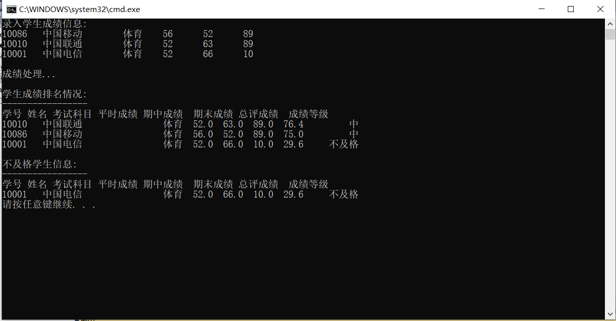 // P280例8.15 // 对教材上的程序作了微调整,把输出学生信息单独编写成一个函数模块 // 打印不及格学生信息和所有学生信息程分别调用 #include<stdio.h> #include<stdlib.h> #include<string.h> #define N 3 // 运行程序输入测试时,可以把N改小一些输入测试 typedef struct student { int id; /*学生学号 */ char name[20]; /*学生姓名 */ char subject[20]; /*考试科目 */ float perf; /*平时成绩 */ float mid; /* 期中成绩 */ float final; /* 期末成绩 */ float total; /* 总评成绩 */ char level[10]; /* 成绩等级 */ } STU; void input(STU[],int ); /*输入学生信息 */ void calc(STU[],int); /*计算总评和等级 */ int fail(STU[],STU [],int); /*不及格学生统计 */ void sort(STU[],int); /*排序 */ void print(STU[], int); /*输出学生信息*/ int main() { STU st[N],fst[N]; // 数组st记录学生信息,fst记录不及格学生信息 int k; // 用于记录不及格学生个数 printf("录入学生成绩信息:\n"); input(st,N); printf("\n成绩处理...\n"); calc(st,N); k = fail(st,fst,N); sort(st, N); printf("\n学生成绩排名情况:\n"); print(st, N); printf("\n不及格学生信息:\n"); print(fst, k); return 0; } // 输入学生信息 void input(STU s[],int n) { int i; for(i=0;i<n;i++) scanf("%d %s %s %f %f %f",&s[i].id,s[i].name,s[i].subject,&s[i].perf,&s[i].mid,&s[i].final); } // 计算总评和等级 void calc(STU s[],int n) { int i; for(i=0;i<n;i++) { s[i].total=s[i].perf*0.2+s[i].mid*0.2+s[i].final*0.6; if(s[i].total>=90) strcpy(s[i].level,"优"); // 注意:等级是字符型数组,要使用strcpy完成赋值 else if(s[i].total>=80 && s[i].total<90) strcpy(s[i].level,"良"); else if(s[i].total>=70 && s[i].total<80) strcpy(s[i].level,"中"); else if(s[i].total>=60 && s[i].total<70) strcpy(s[i].level,"及格"); else strcpy(s[i].level,"不及格"); } } // 不及格学生统计 // 数组s存放的是所有学生信息,数组t存放不及格学生信息,n是数组s中元素个数 // 函数返回值:返回的是不及格人数 int fail(STU s[],STU t[],int n) { int i,k=0; for(i=0;i<n;i++) if(s[i].total<60) t[k++]=s[i]; return k; } // 根据总评成绩对学生记录信息排序 // 使用的是冒泡排序算法 void sort(STU s[],int n) { int i,j; STU temp; for(i=0;i<n-1;i++) for(j=0;j<n-1-i;j++) if(s[j].total<s[j+1].total) { temp = s[j]; s[j] = s[j+1]; s[j+1] = temp; } } // 输出学生信息 void print(STU s[], int n) { int i; printf("-----------------\n"); printf("学号 姓名 考试科目 平时成绩 期中成绩 期末成绩 总评成绩 成绩等级\n"); for(i=0;i<n;i++) printf("%5d %10s%20s %5.1f %5.1f %5.1f %5.1f %10s\n",s[i].id,s[i].name,s[i].subject,s[i].perf,s[i].mid,s[i].final,s[i].total,s[i].level); }