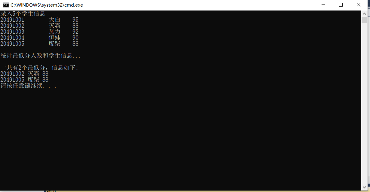#include <stdio.h> const int N=5; // 定义结构体类型struct student,并定义STU为其别名 typedef struct student { long no; char name[20]; int score; }STU; // 函数声明 void input(STU s[], int n); int findMinlist(STU s[], STU t[], int n); void output(STU s[], int n); int main() { STU stu[N], minlist[N]; int count; printf("录入%d个学生信息\n", N); input(stu, N); printf("\n统计最低分人数和学生信息...\n"); count = findMinlist(stu, minlist, N); printf("\n一共有%d个最低分,信息如下:\n", count); output(minlist, count); return 0; } // 输入n个学生信息,存放在结构体数组s中 void input(STU s[], int n) { int i; for(i=0; i<n; i++) scanf("%ld %s %d", &s[i].no, s[i].name, &s[i].score); } // 输出结构体s中n个元素信息 void output(STU s[], int n) { int i; for(i=0; i<n; i++) printf("%ld %s %d\n", s[i].no, s[i].name, s[i].score); } // 在结构体数组s中,查找最低分学生的记录,将其存入结构体数组t中 // 形参n是结构体数组s中元素个数 // 函数返回最低分的学生人数 int findMinlist(STU s[], STU t[], int n) { n=0; int i,min; min=s[0].score; for(i=0;i<N;i++){ if(s[i].score<min) min=s[i].score; } for(i=0;i<N;i++){ if(s[i].score==min) t[n++]=s[i]; } return n; }
