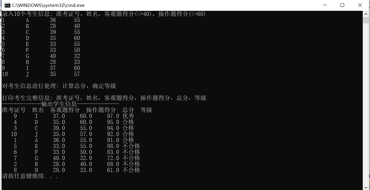 #include <stdio.h> #include <string.h> const int N = 10; // 定义结构体类型struct student,并定义其别名为STU typedef struct student { long int id; char name[20]; float objective; /*客观题得分*/ float subjective; /*操作题得分*/ float sum; char level[10]; }STU; // 函数声明 void input(STU s[], int n); void output(STU s[], int n); void process(STU s[], int n); int main() { STU stu[N]; printf("录入%d个考生信息: 准考证号,姓名,客观题得分(<=40),操作题得分(<=60)\n", N); input(stu, N); printf("\n对考生信息进行处理: 计算总分,确定等级\n"); process(stu, N); printf("\n打印考生完整信息: 准考证号,姓名,客观题得分,操作题得分,总分,等级\n"); output(stu, N); return 0; } // 录入考生信息:准考证号,姓名,客观题得分,操作题得分 void input(STU s[], int n) { // 补足代码 // ××× for (int i = 0; i < n; i++) scanf("%ld %s %f %f",&s[i].id,s[i].name,&s[i].objective,&s[i].subjective); } //输出考生完整信息: 准考证号,姓名,客观题得分,操作题得分,总分,等级 void output(STU s[], int n) { // 补足代码 // ××× printf("-------------输出学生信息--------------\n"); printf("准考证号 姓名 客观题得分 操作题得分 总分 等级\n"); for (int i = 0; i < n; ++i) printf("%5ld %6s %8.1f %8.1f %8.1f %4s\n",s[i].id,s[i].name,s[i].objective,s[i].subjective,s[i].sum,s[i].level); } // 对考生信息进行处理:计算总分,排序,确定等级 void process(STU s[], int n) { // 补足代码 // ××× for (int i = 0; i < n; ++i) s[i].sum=s[i].objective+s[i].subjective; STU temp; for (int i = 0; i < n-1; i++) { for (int j = 0; j < n-1-i; j++) { if (s[j].sum<s[j+1].sum){ temp=s[j]; s[j]=s[j+1]; s[j+1]=temp; } } } for (int i = 0; i < n; i++) { if (i<=(n/10)-1) strcpy(s[i].level,"优秀"); else if (i<=(n/2)-1) strcpy(s[i].level,"合格"); else strcpy(s[i].level,"不合格"); } }