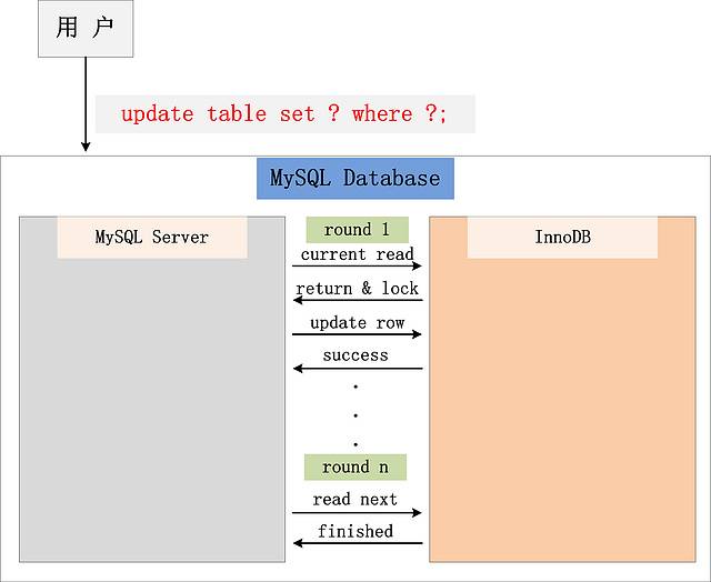注:根据上图的交互,针对一条当前读的SQL语句,InnoDB与MySQL Server的交互,是一条一条进行的,因此,加锁也是一条一条进行的。先对一条满足条件的记录加锁,返回给MySQL Server,做一些DML操作;然后在读取下一条加锁,直至读取完毕。
