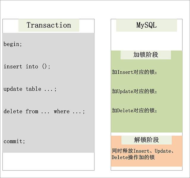 传统RDBMS加锁的一个原则,就是2PL (二阶段锁):Two-Phase Locking。相对而言,2PL比较容易理解,说的是锁操作分为两个阶段:加锁阶段与解锁阶段,并且保证加锁阶段与解锁阶段不相交。下面,仍旧以MySQL为例,来简单看看2PL在MySQL中的实现。