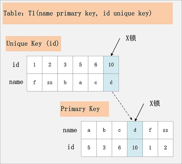 结论:若id列是unique列,其上有unique索引。那么SQL需要加两个X锁,一个对应于id unique索引上的id = 10的记录,另一把锁对应于聚簇索引上的[name=’d’,id=10]的记录。
