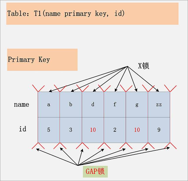 由于id列上没有索引,因此只能走聚簇索引,进行全部扫描。从图中可以看到,满足删除条件的记录有两条,但是,聚簇索引上所有的记录,都被加上了X锁。无论记录是否满足条件,全部被加上X锁。既不是加表锁,也不是在满足条件的记录上加行锁。