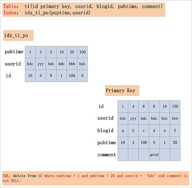 - Index key:pubtime > 1 and puptime < 20。此条件,用于确定SQL在idx_t1_pu索引上的查询范围。