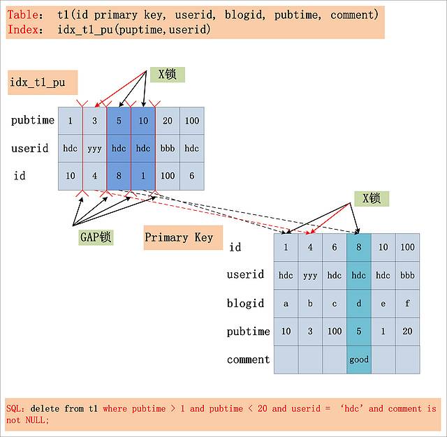 从图中可以看出,在Repeatable Read隔离级别下,由Index Key所确定的范围,被加上了GAP锁;Index Filter锁给定的条件 (userid = ‘hdc’)何时过滤,视MySQL的版本而定,在MySQL 5.6版本之前,不支持Index Condition Pushdown(ICP),因此Index Filter在MySQL Server层过滤,在5.6后支持了Index Condition Pushdown,则在index上过滤。若不支持ICP,不满足Index Filter的记录,也需要加上记录X锁,若支持ICP,则不满足Index Filter的记录,无需加记录X锁 (图中,用红色箭头标出的X锁,是否要加,视是否支持ICP而定);而Table Filter对应的过滤条件,则在聚簇索引中读取后,在MySQL Server层面过滤,因此聚簇索引上也需要X锁。最后,选取出了一条满足条件的记录[8,hdc,d,5,good],但是加锁的数量,要远远大于满足条件的记录数量。
