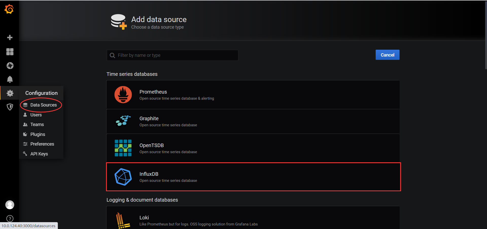 首先是添加数据源,点击左上角的grafana图标,示例如下:
