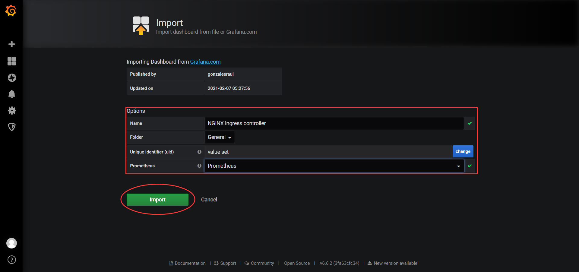 这里选择相关的仪表盘,选择导入,示例如下: