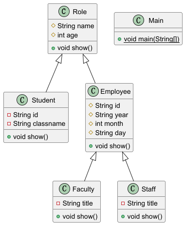 该题需要设计一个角色类系统,包含学生和员工等不同角色。这个题目主要考察对面向对象设计原则的理解,尤其是类的继承和多态性。