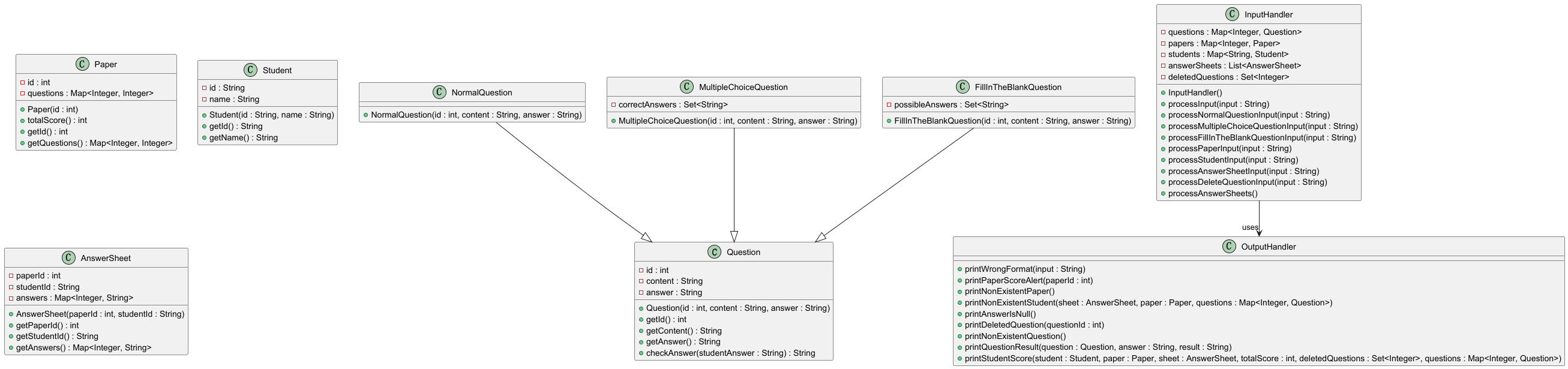 本题要求设计一个答题判题系统,这是一道相对复杂的题目,涉及多种题型的处理和答案判定。为了实现这一功能,我设计了多个类,分别负责题目管理、试卷管理、学生信息管理和答卷判定。