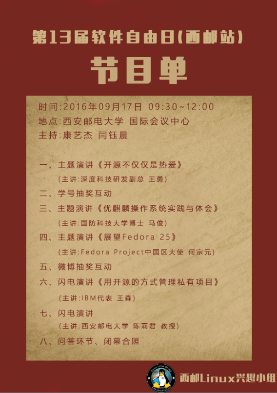 此次活动由西邮Linux兴趣小组主办,Canonical、deepin、Fedora Project、Firefox、IBM、RedHat、Ubuntu Kylin等企业和社区协办并且给予了大力支持。西邮Linux兴趣小组由王亚刚老师带领同学成立于2006年,是国内知名开源技术社区,今年已经是第十一次成功举办“软件自由日”活动。