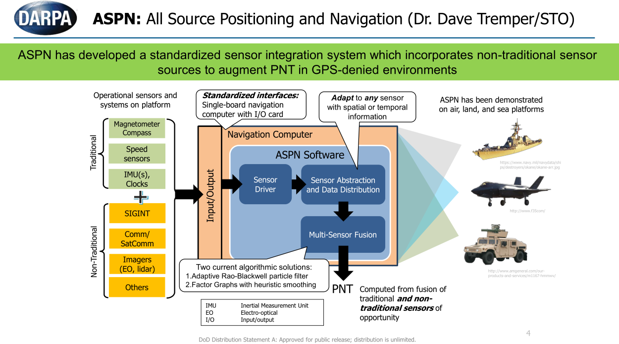AFRL导航和通信分部传感器局的马克·斯米尔切克表示,空军研究实验室已建成一套系统,该传感器装置名为“全源定位和导航”(ASPN)系统,允许将备用传感器的信息导入飞机标准导航装置。美空军随即拥有自己的备用导航算法,并能将调整后的备用导航传感器信息导入标准导航装置,从而使得战斗机在GPS信号极弱的环境中也能正常飞行。
