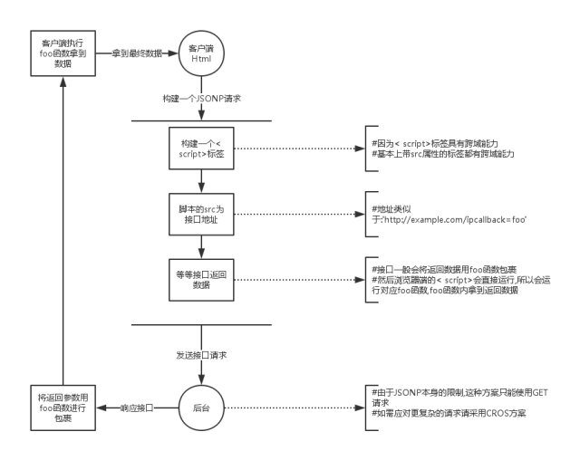 JSONP之所以能够用来解决跨域方案,主要是因为 <script> 脚本拥有跨域能力,而JSONP正是利用这一点来实现。具体原理如图