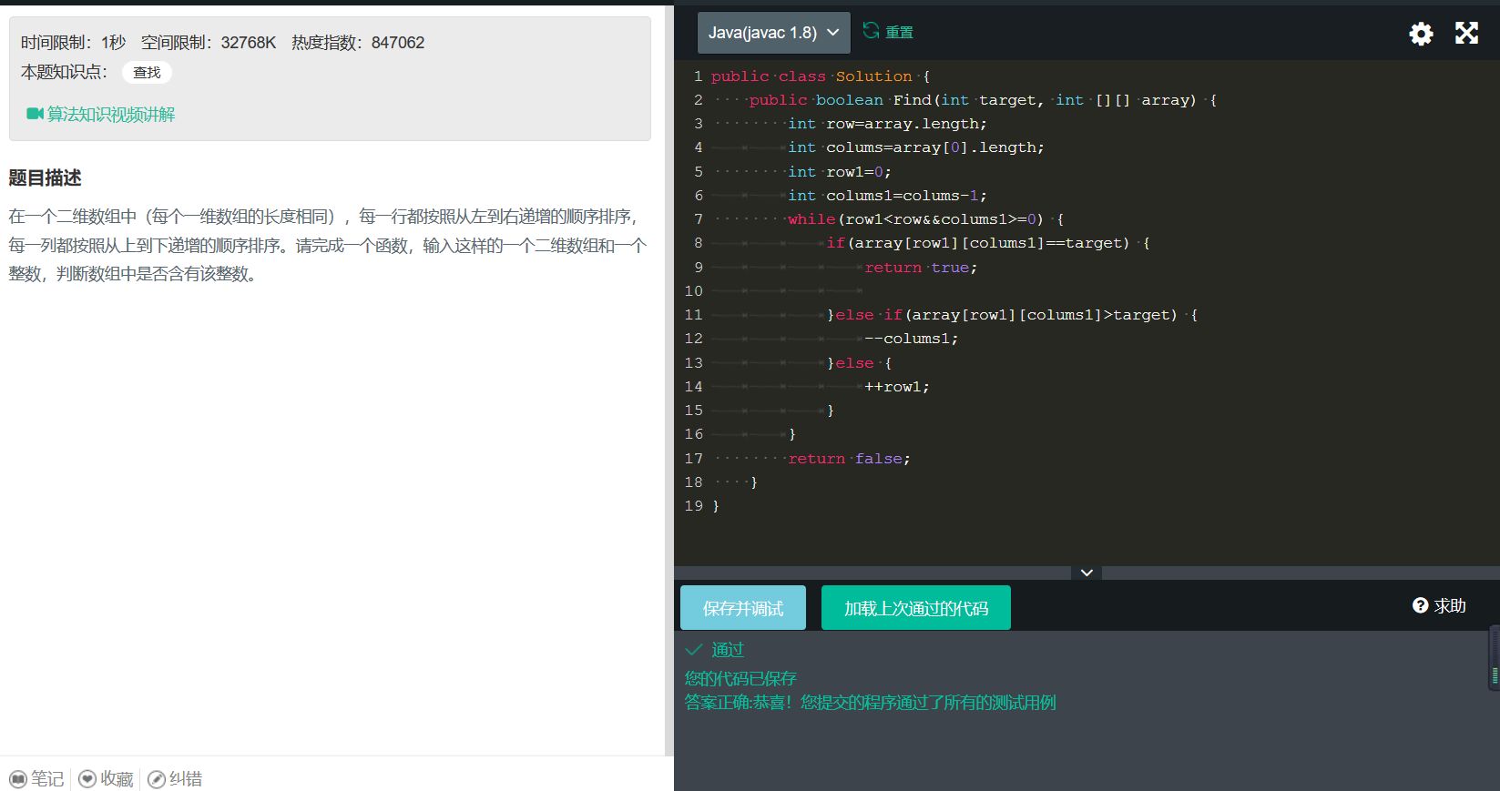 1 public class Solution { 2 public boolean Find(int target, int [][] array) { 3 int row=array.length; 4 int colums=array[0].length; 5 int row1=0; 6 int colums1=colums-1; 7 while(row1<row&&colums1>=0) { 8 if(array[row1][colums1]==target) { 9 return true; 10 }else if(array[row1][colums1]>target) { 11 --colums1; 12 }else { 13 ++row1; 14 } 15 } 16 return false; 17 } 18 }