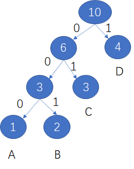 如A出现1次 B出现2次 C出现3次 D出现4次,构造的huffman树如下: