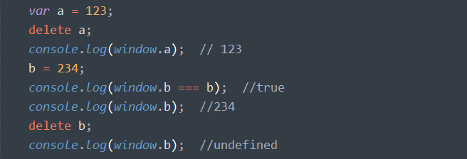 它们的区别是,经过声明的全局变量是无法被delete操作符删除,但是未经声明的全局变量能够被delete删除掉。