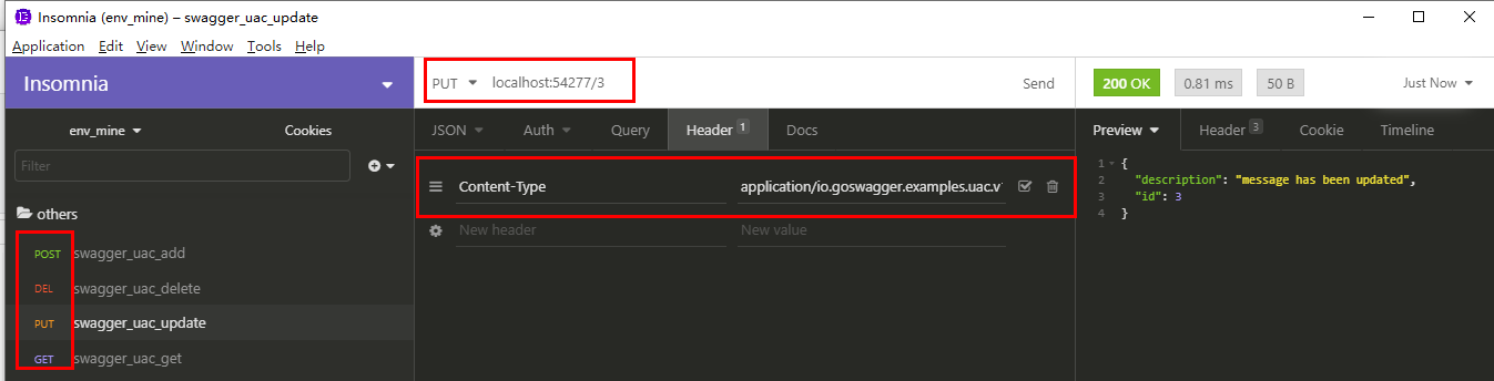 $ curl -i localhost:63192/3 -d "{\"description\":\"message has been updated\"}" -X PUT -H 'Content-Type: application/io.goswagger.examples.uac.v1+json'